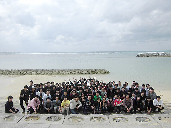 沖縄の海をバックに集合写真!みんないい笑顔しています。