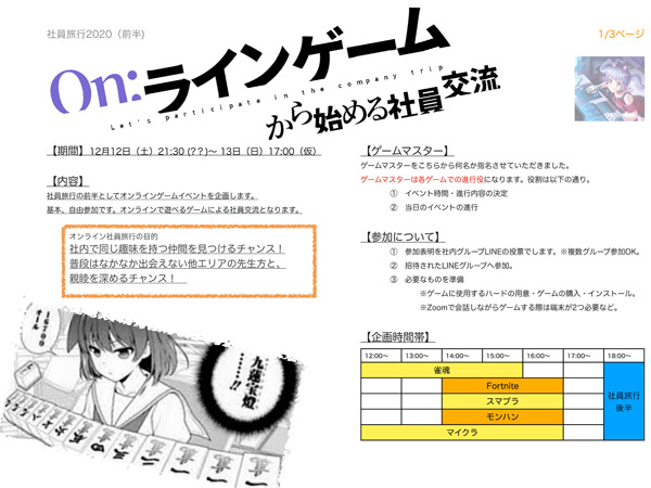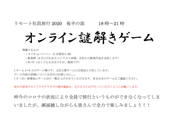 2020社員旅行~オンライン~ コロナ禍のため、12月にオンラインで行いました。面と向かって会うことはできませんでしたが、オンラインならではのイベントが用意され、大いに盛り上がりました!